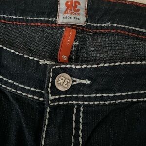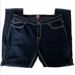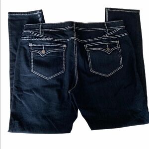 Revolt Skinny Stretch Jeans with defined stitching and flap back pockets. Zip fly closure. Inner upper thigh area has some wear and slight pilling of denim as per picture.