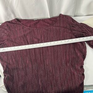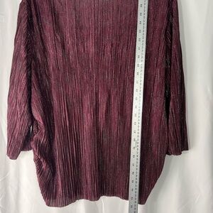 Beautiful plum-colored pleated blouse by Revolution & Co. Features a shimmery metallic thread throughout for a subtle sparkle effect. The fabric is lightweight and stretchy with vertical pleats that flatter any figure. Perfect for evening outings, parties, or holidays. Round neckline, 3/4 sleeves, and a relaxed drape fit for comfort and style.