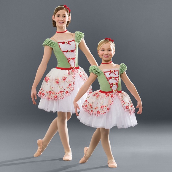 Stretch velvet leotard with nude adjustable straps has spandex inset with pleated metallic organdy overlay trimmed with flowers and glitter rickrack. Attached bows and faux waistband are velvet. European-length tutu has alternating layers of tulle and metallic organdy under an embroidered floral organza peplum.