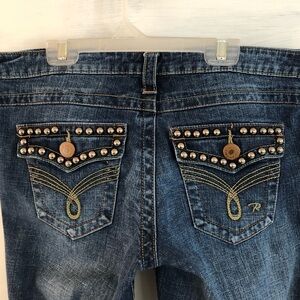 Revolution Jeans. Rivets studs to front & back pockets, distressed mainly to front, low to mid rise of 8.5” & flare Jean bottom.
