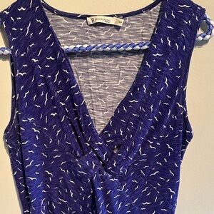 Blue tank with white bird accents. Features a deep V-neck. Ideal for casual wear.