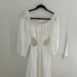 The ASTR The Label Cassian Dress in white features an off-shoulder neckline that leads to a cutout bodice and tie waist details. The flowy midi skirt and long sleeves gives the perfect boho vibe.