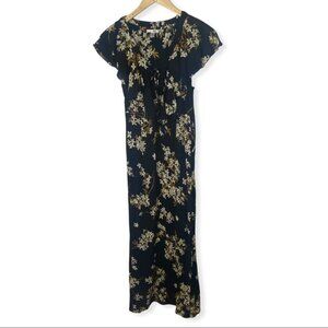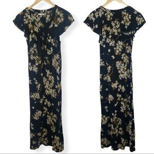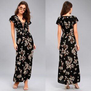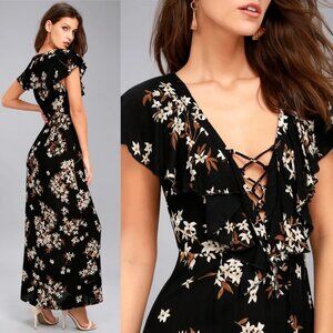 Amuse Society Alana Black Floral Print Lace-Up Maxi Dress in Women's Size XS. From Revolve but also sold at Lulu's. Retails for $65 USD (approximately $90 CAD). Gauzy, woven fabric features an enchanting cream and brown floral print as it falls into ruffled short sleeves, a lace-up neckline, and darted bodice. Fitted waist tops a figure-skimming maxi skirt. Hidden side zipper. Unlined and semi-sheer. 100% viscose. Hand wash. Very good pre-loved condition. No visible flaws.