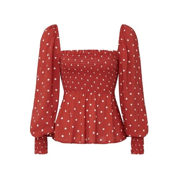 Auguste the Label Red Polly Sunday Top from Revolve in Women's Size 2. Made with those do-no-wrong polka dots, a shirred bust, and romantic blouson sleeves, this easy-to-love Auguste blouse has classic overtones that do so well with denim. 100% rayon. Square neck. Retails for $139 USD (approximately $194 CAD). Good pre-loved condition but note there is a hole that was stitched. See photos.
