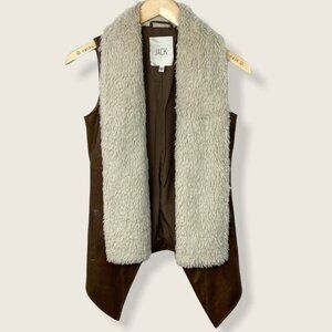 Jack BB Dakota Elaine Two Tone PU Leather Vest with Sherpa Fleece Faux Fur Trim in Brown and Women's Size XS. From Revolve. Faux leather with faux fur trim and lining. Open front. Front welt pockets. Asymmetric hem. Very good pre-loved condition but note there is a bit of wear on the back - see second last photo.