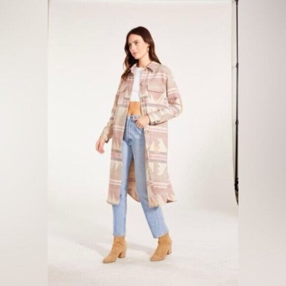 Southwest-inspired patterning lends a free-spirited feel to this BB Dakota overcoat, sure to be a new favorite for layered fall looks. Fabric: Heavyweight brushed blanket weave. Southwest-inspired pattern.