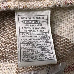 Fold-over collar and button placket. Patch breast pockets, on-seam hip pockets. Long sleeves with button cuffs. Shell: 67% polyester/14% acrylic/10% viscose/5% nylon/4% wool. Unlined.