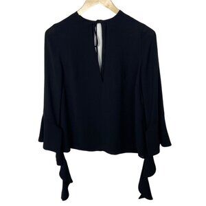 C/MEO Collective Ruffle Sleeve Keyhole Top in Black and Women's Size Small. From Revolve. Concealed back zipper placket. Gossamer spelt out long sleeve top in black. Features split ruffle sleeves with a keyhole opening in the front. Very good pre-loved condition. No visible flaws.