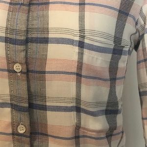 Description: White/plaid button-down with back-pleat detail in like-new condition with no signs of use/wear. Will arrive clean and ready-to-wear from a pet and smoke-free home.