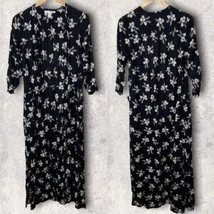 Amuse Society Izzy Kimono in Black Sands Floral and Women's Size Small. This duster maxi cardigan from Revolve is perfect for the beach or travel. Super lightweight. Looks great over anything. Full length that features elbow length sleeves and patch pockets. 100% modal. Machine washable. Retails for $68 USD (approximately $95 CAD). Made in India. Very good pre-loved condition. No visible flaws.