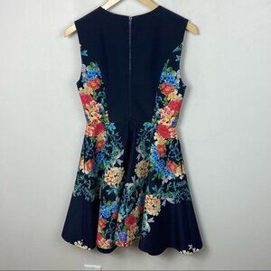 Keepsake The Label Second Chance Navy Blue Floral Print Dress in Women's Size XS. As seen in Refinery29. A colourful floral pattern transforms this thick navy blue woven fabric from elegant to exquisite as it blooms down the sides and back of a striking skater silhouette. Modified racerback. Fitted. Sleeveless bodice. Subtle v-neck. Full skirt that flares out from a fitted waistline. Exposed back zipper. Fully lined. 97% poly and 3% elastane. Lined.