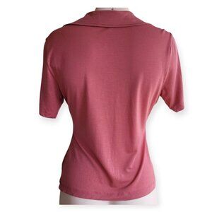This L'Academie top in deep sea coral offers a blend of casual elegance with a body-hugging fit and front button closure.
