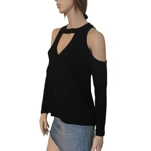 Features: Super soft textile, exaggerated cold shoulder with choker detail and V-neckline, long sleeve, stretch fabric, straight lines