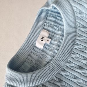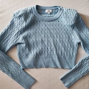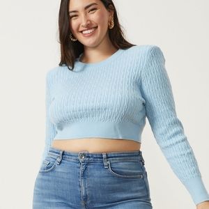 Revolve LPA Poppy Cable Knit Padded Shoulder Wool Blend Blue Cropped Sweater