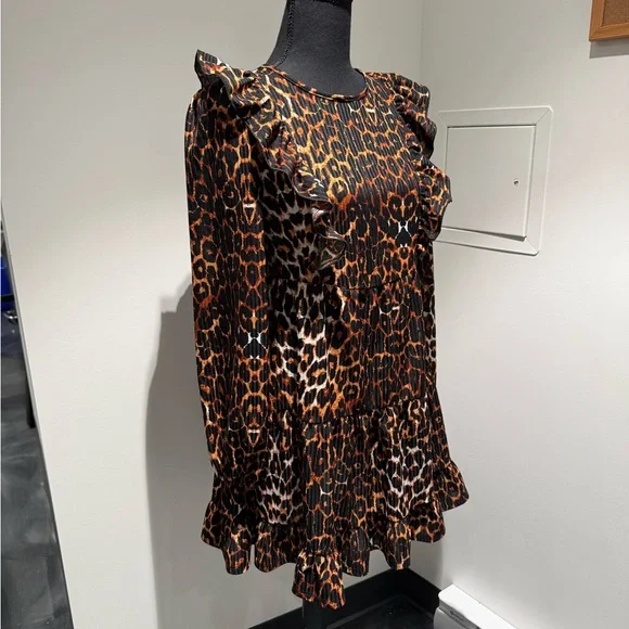 Stand out with this chic leopard print mini featuring elegant ruffles. Perfect for adding a wild touch to your wardrobe.