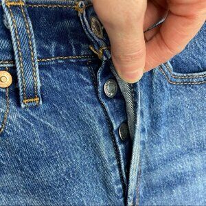 Levi's Wedgie Straight Jeans from Revolve in Women's Size 24 in Colour Love Triangle. 99% cotton and 1% elastane. Light fading and whiskering along front. Intentionally distressed detail. Medium blue colour. Button fly. Excellent pre-loved condition. No visible flaws.