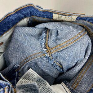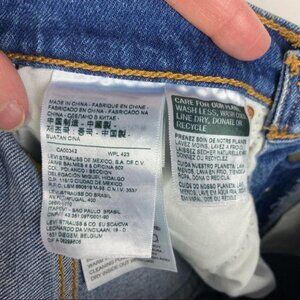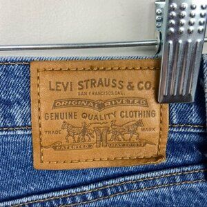 Levi's Wedgie Straight Jeans from Revolve in Women's Size 24 in Colour Love Triangle. 99% cotton and 1% elastane. Light fading and whiskering along front. Intentionally distressed detail. Medium blue colour. Button fly. Excellent pre-loved condition. No visible flaws.