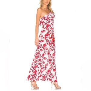 Beautiful one shoulder maxi dress by Lovers + Friends. Light pink base color with an all over red floral poppy print. Tassels have little parrots and beads on them. Please see all photos.