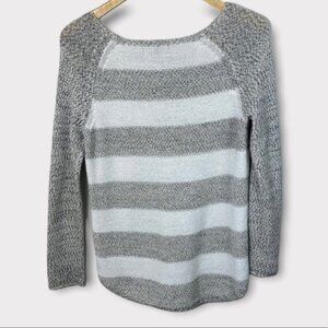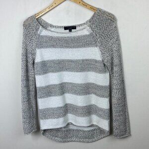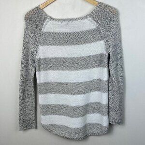 Sanctuary Striped Grey and White Baseball Knit Sweater in Women’s Size XS. From revolve. Long sleeves. Crew neck. Cotton / poly blend. Very good pre-loved condition. No visible flaws. Note that the model photo is inverse colours.