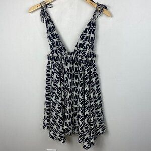 T. Bags Los Angeles Handkerchief dress in rectangular print and women's size small. Banded empire waist. Sleeveless. Spaghetti straps that tie at the shoulders. Flowing full skirt. Deep v-neckline. Handkerchief hem. Fit and flare silhouette. Pullover style. Viscose. Unlined. Made in the USA. Very good pre-loved condition. No visible flaws.