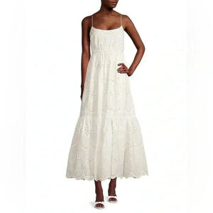 This tiered eyelet midi-dress from Hope for Flowers by Tracey Reese features an open back with a cross-back tie closure finished with tassels and beads. An embroidered scalloped hem completes this empire-waist silhouette.