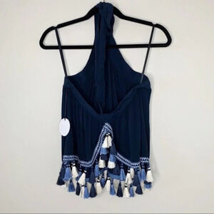 Revolve Tularosa Cory Halter Top Navy Blue Tassels Open Back Embroidered Size XS