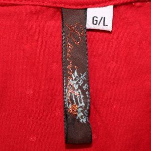 Red wide v-neck hooded shirt and skater skirt from Rewind. Features white polka dots all over both pieces, and skirt is reversible to reveal red and white diagonal stripes. Worn and washed less than five times. Striped side of skirt has some visible pilling. Made in China. 100% cotton. Flat measurements are: 18"(36") bust, 17"(34") waist, 19"(38") hips for shirt, and 17½"(35") waist for skirt. Material has a 35% stretch limit. Comes from a smoke-free home that has pets. Tags: y2k, skater
