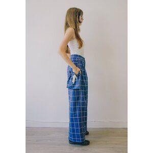 Rework Plaid Pouch Pocket Flared Pleated Cargo Pants Navy Blue White