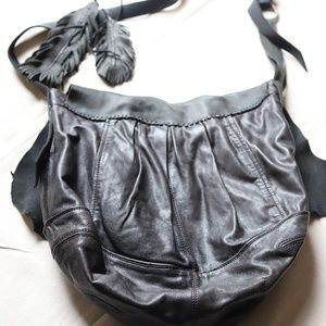 The front leather panel / flap is a soft fine goat leather and was hand stitched to an existing Andrew Marc bag by my friend. The leather feathers are hand stitched and detachable. This is a truly unique bohemian, festival style bag. Excellent second hand condition, no scratches or signs of wear, lined with sand coloured cotton.