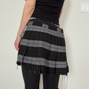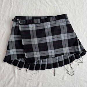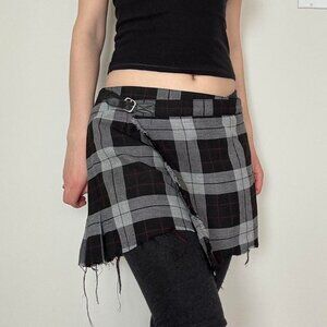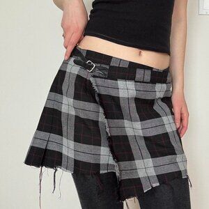 vintage reworked asymmetrical pleated plaid mini skirt with fraying. back is a bit shorter than the front. best for over pants or tights!