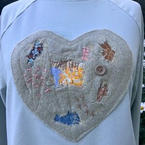 This reworked and preloved sweater carries all the charm of a piece that’s been renewed with heart and intention. Light green and slightly distressed, it features a handcrafted wool Tattered Heart patch — tattered, torn, and lovingly mended with freestyle embroidered details, tiny bits of reclaimed fabric, and a vintage button.