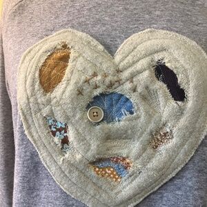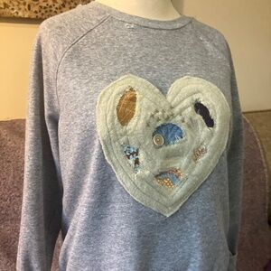 Unique, handcrafted one-of- a-kind Tattered Heart Sweatshirt. Made using preloved and reclaimed materials. Size 8. A sweet gift for yourself, your Valentine.