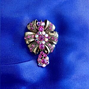 Rhinestone Brooch, in pink/purple. Never used. All rhinestones secure and in place. An elegant addition to many outfits. Beautiful shine.