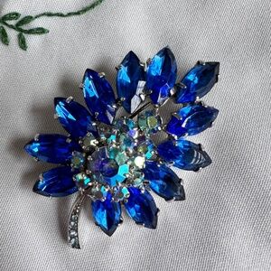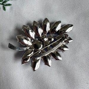 Simply beautiful! Unsigned leaf shape brooch features navette cut rhinestones combined with round cut aurora borealis stones; stem has small light blue round stones; has working safety clasp. Earrings have variety of matching stones. Closures working well. Brooch is 2.25 inches x 1.25 inches; earrings are 1.25" x 1".