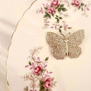 A stunning, rhinestoned, vintage-inspired butterfly brooch on a gold-alloy frame. Classic. Elegant. Sparkly.
