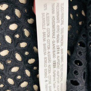 Navy cotton boxy eyelet top is rhinestone studded with short sleeves and has neck button closure. Top sits above hip.