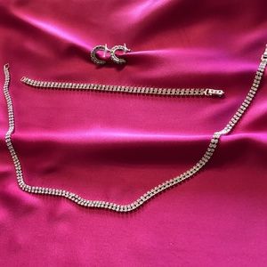 Beautiful, double row rhinestone necklace, bracelet and earrings set, silver colour and clear stones.
