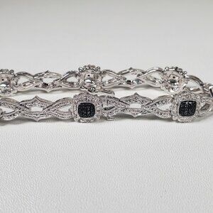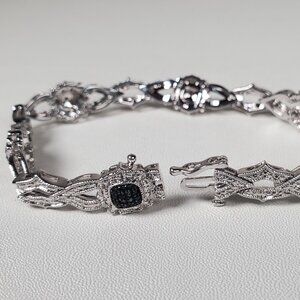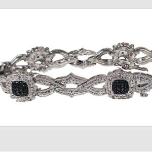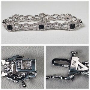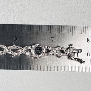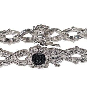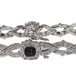 Add a touch of glamour with this stunning rhodium-plated brass bracelet! Combining timeless sparkle with modern style, it features rows of shimmering black and clear stones (likely cubic zirconia) accented with tiny black stones for a bold, elegant contrast.