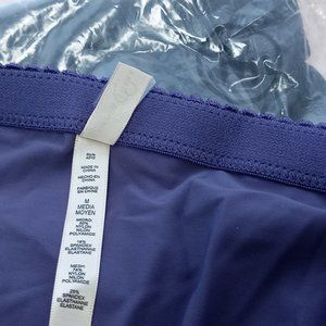 • Elastic, mid-rise, smooth stretch fabrication, mesh inset at waist and leg, brushed back elastic waistband