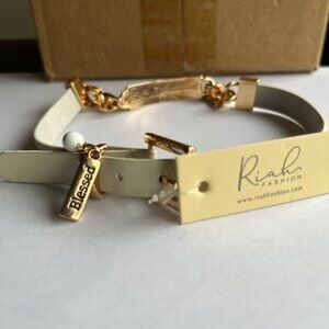 Length 16.5”. Double wrap with buckle closure. Stamped “Blessed” on bar and on charm. Material” Gold tone metal and Faux leather. NWT.
