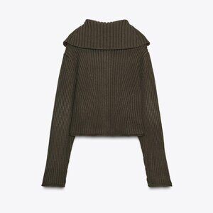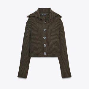 Cardigan with lapel collar and long sleeves. Rib knit fabric. Front button closure. Color is Dark Khaki. Size M. New!