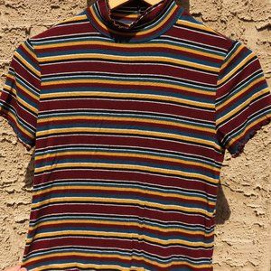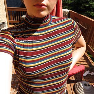 Autumn-coloured striped ribbed shirt from Garage, baby turtle neckline, ruffled sleeves and collar