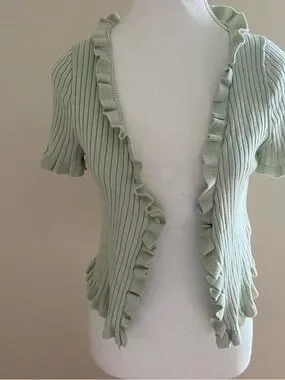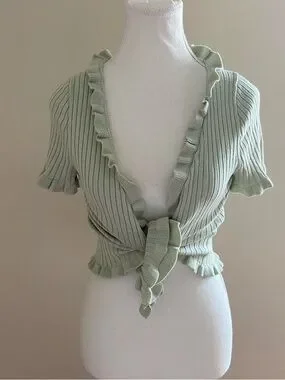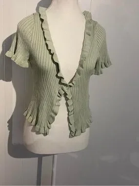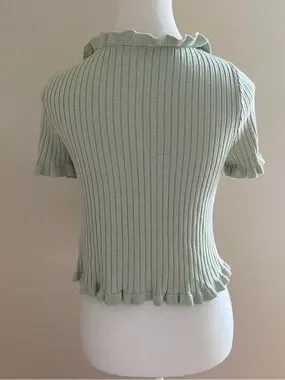 Lightweight ribbed knit top with feminine ruffle trim. Features a deep V-neck and single-button front for a flattering silhouette. Short sleeves and soft sage green color make it easy to pair for everyday wear.