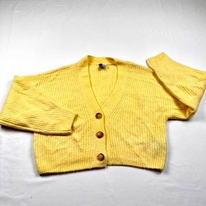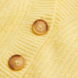 Cardigan in soft, rib-knit fabric with wool content. V-neck, buttons at front, dropped shoulders, and long, wide sleeves with close-fitting cuffs.