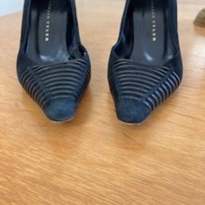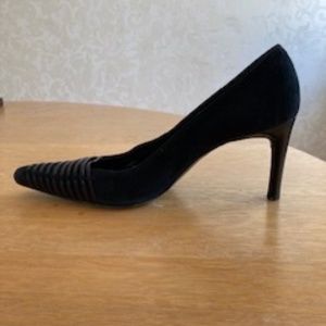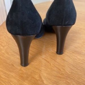 Suede with leather detail. 3 1/4 inch heel. Very good condition.