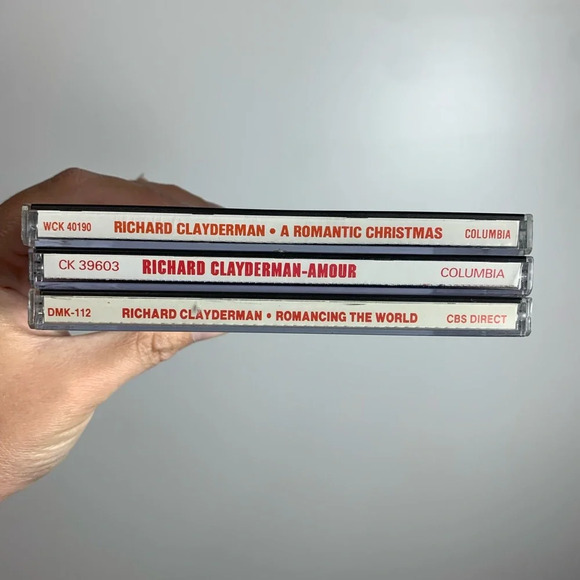 Richard Clayderman CD LOT includes three romantic albums: "Amour," "Romancing The World," and "A Romantic Christmas." Perfect for the holiday season, the CDs feature the renowned artist's signature easy listening and romantic style. Released by CBS Records, these albums offer a delightful musical experience for any occasion, especially during Christmas. Ideal for fans of Clayderman's soothing melodies, this collection is a must-have for those who appreciate beautiful piano music.