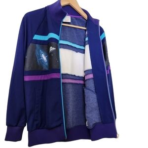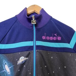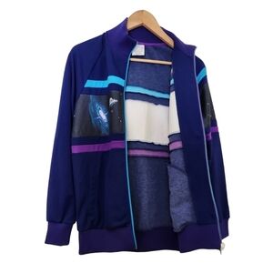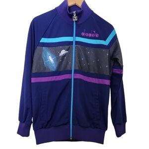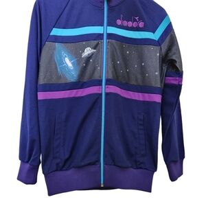 Rick & Morty diadora, space and planets blue and purple zip-up, long-sleeve sweater, limited edition. Zip-up front with Fold-down collar, long-sleeves, two front pockets, stretchy elastic cuffs,waistband and collar. Super comfortable, stretchy and in great condition size xxs
