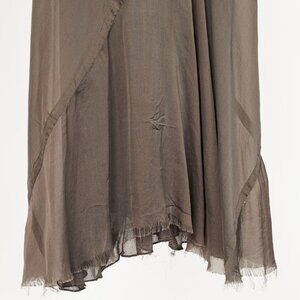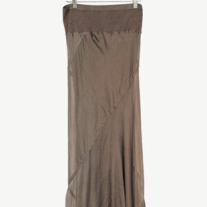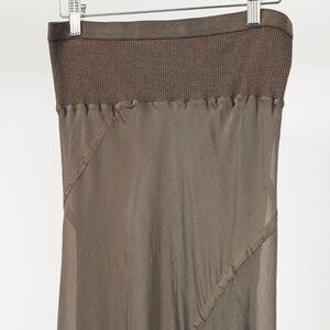 Made in the U.S.A., this bias-cut skirt from Rick Owens' 2011 Spring and Summer mainline collection entitled "Anthem", and is crafted with a drapey silk blend in a Dust grey. It features an elastic waistband, brown ribbed trim, diagonal seaming, a frayed midi-length hem, and is lined in a tonal crepe.