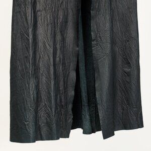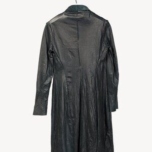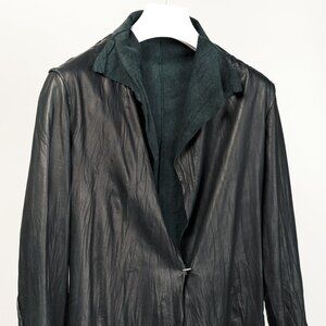 This unlined coat from Rick Owens is crafted in a black wrinkled leather, and features long sleeves, a flyaway lapel collar, front hook closures, and is finished off with exposed raw-edge seams and hems.