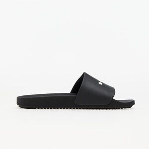 Logo-print slides from RICK OWENS DRKSHDW featuring black, milk white, logo print to the front, slip-on style, open toe and flat rubber sole.